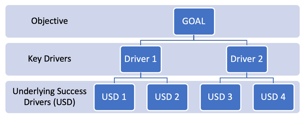 A goal should be treated a little like an organisation chart (pictured), below the key objective there are many drivers of differing types.